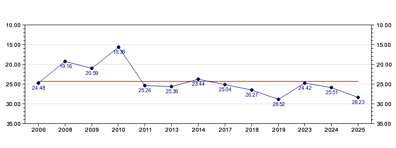 | Forrige tid | 28.23 (2025) |