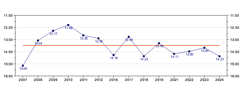 | Forrige tid | 14.23 (2024) |