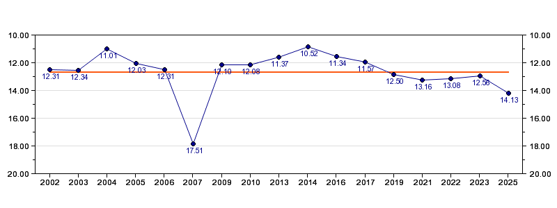 Antall deltagelser17 (i perioden 2002 - 2025)