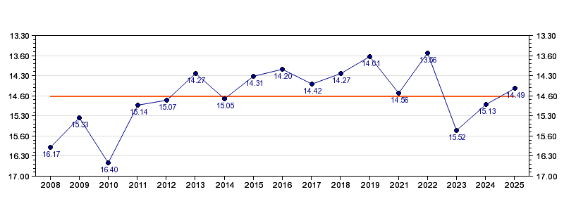 Antall deltagelser17 (i perioden 2008 - 2025)