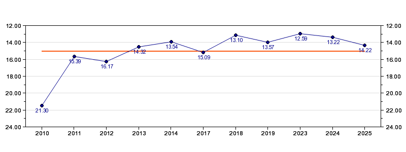 | Forrige tid | 14.22 (2025) |