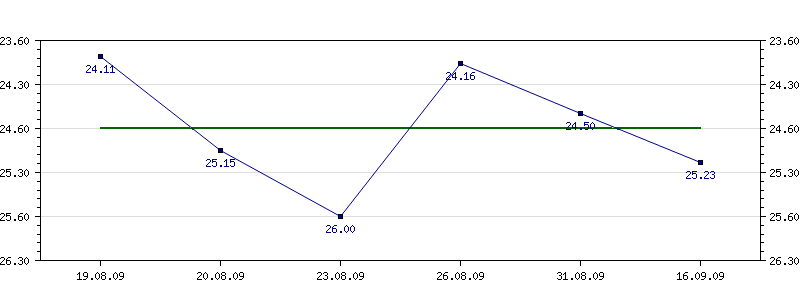 | 19.08.2009 | 24.11 | 20.08.2009 | 25.15 | 23.08.2009 | 26.00 | 26.08.2009 | 24.16 | 31.08.2009 | 24.50 | 16.09.2009 | 25.23 |