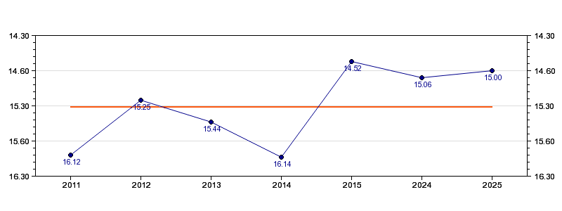 | Forrige tid | 15.00 (2025) |