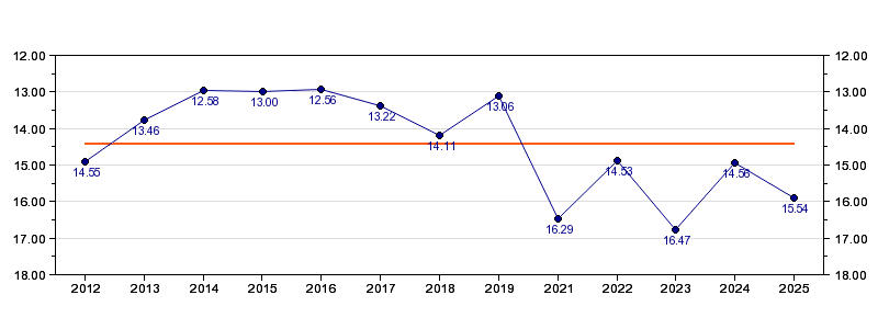 Antall deltagelser13 (i perioden 2012 - 2025)