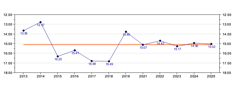 Antall deltagelser12 (i perioden 2013 - 2025)