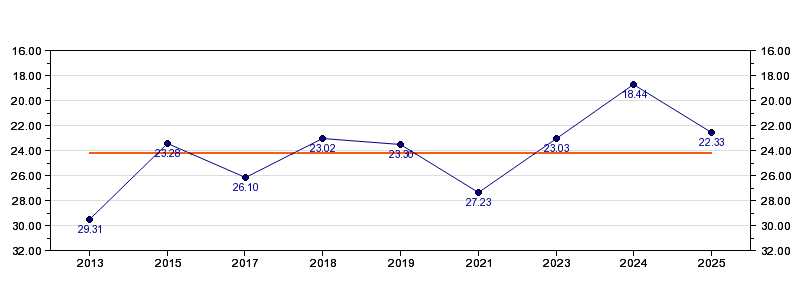 Antall deltagelser9 (i perioden 2013 - 2025)