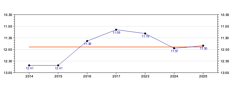 | Forrige tid | 11.50 (2025) |